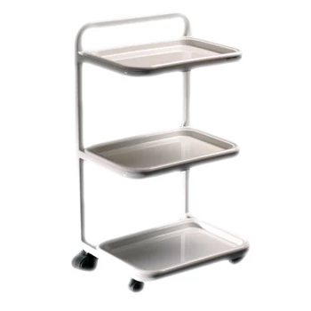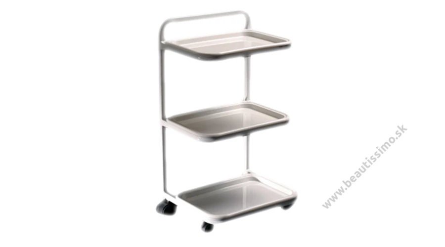 Kozmetický stolík s kovovým rámom na kolieskach s tromi plastovými poličkami. Poličky - tácky sú odnímateľné, čím sa zjednodušuje ich čistenie, údržba a manipulácia. Výška: 68,5 cm Šírka: 37,5 cm Dĺžka: 27 cm