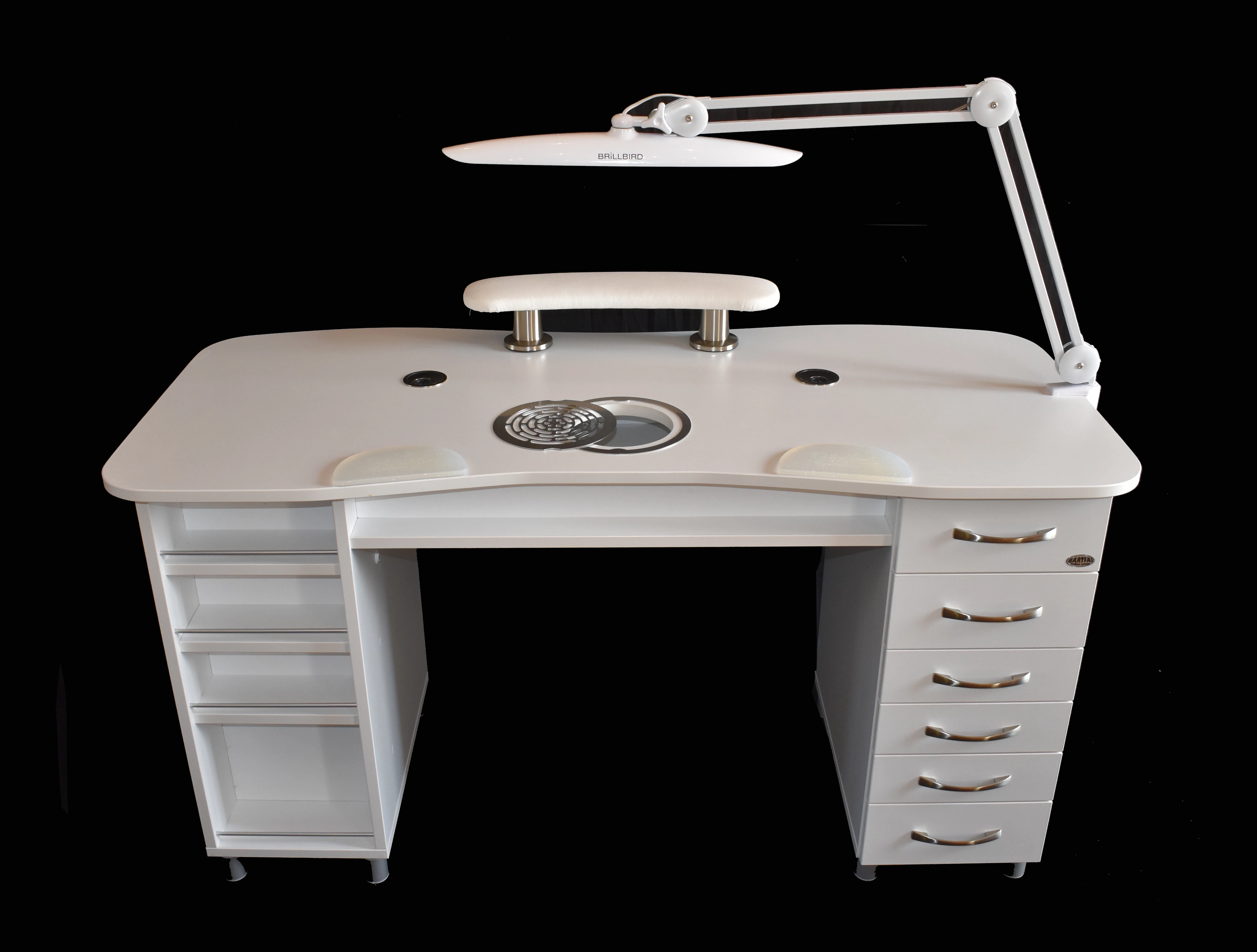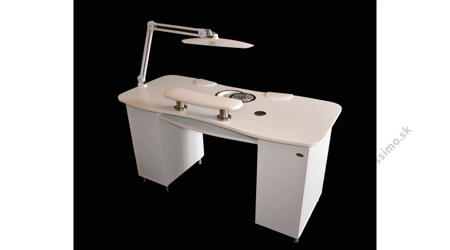 Manikérsky stôl so zabudovanou odsávačkou prachu a zabudovanými 5 elektrickými zásuvkami. Ručne vyrábaná oblúková pracovná doska so zaoblenými rohmi.