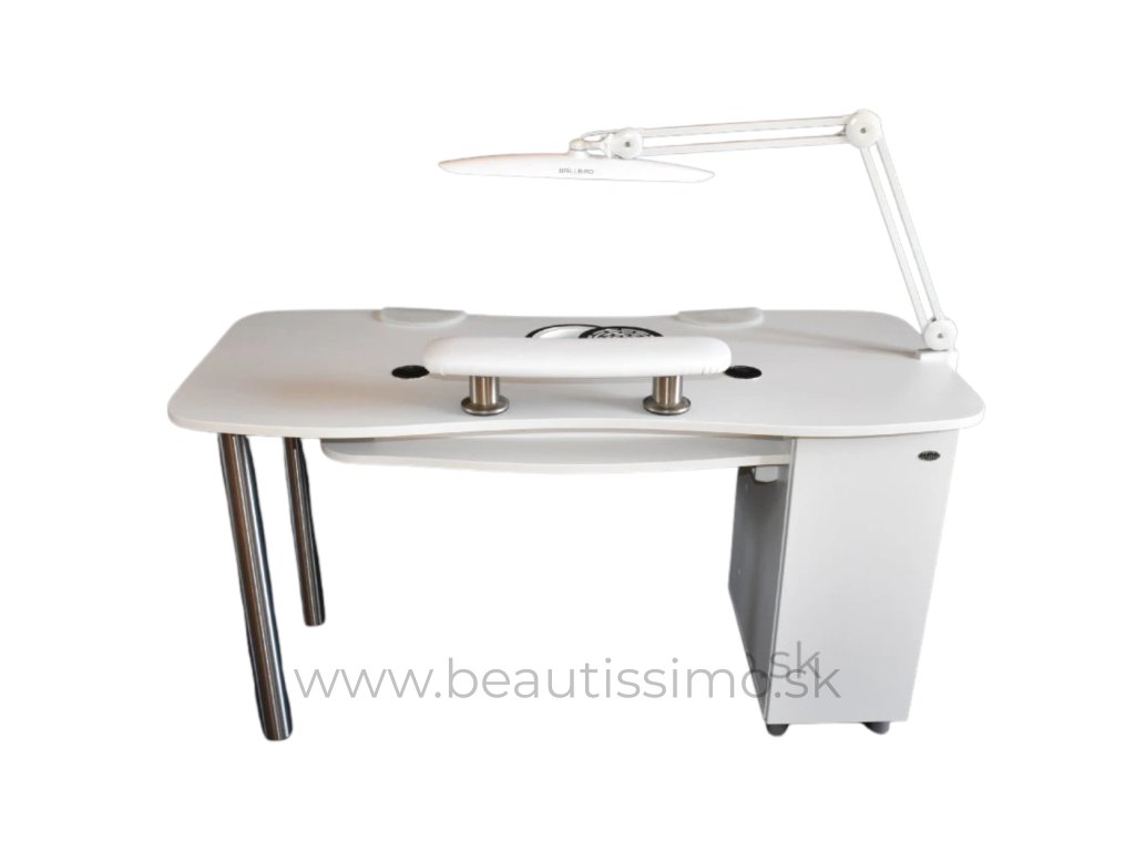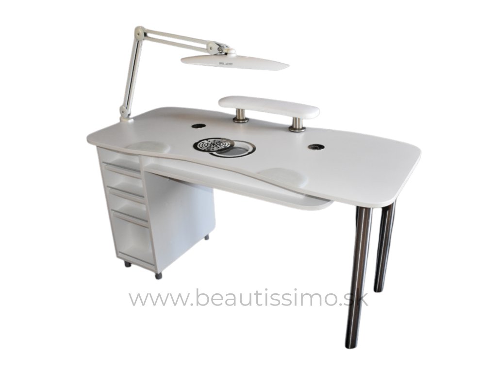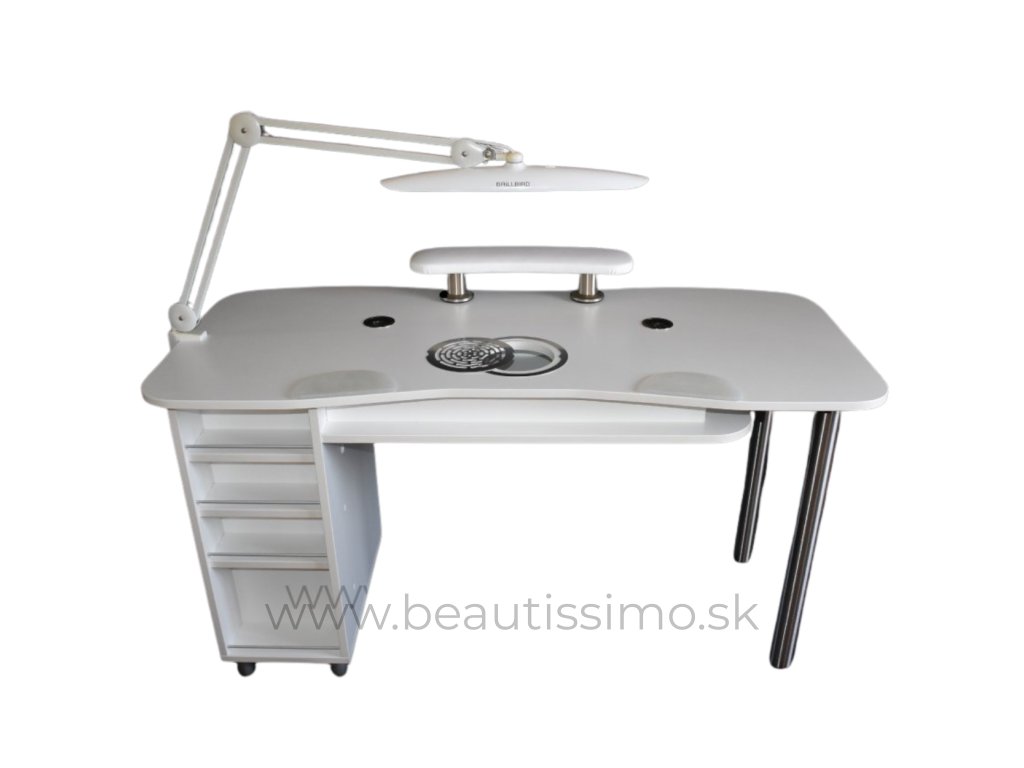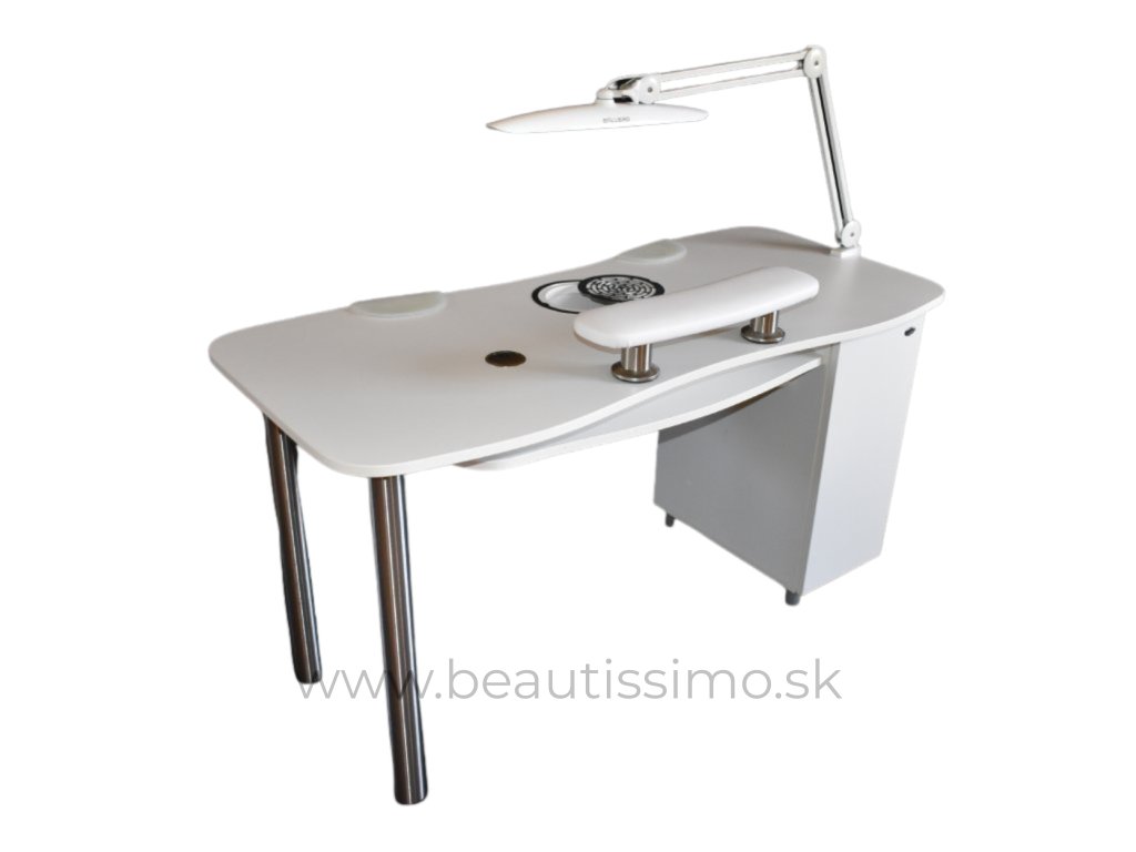 Profesionálny stôl pre manikúru s integrovanou odsávačkou prachu a praktickými riešeniami pre kozmetičky.