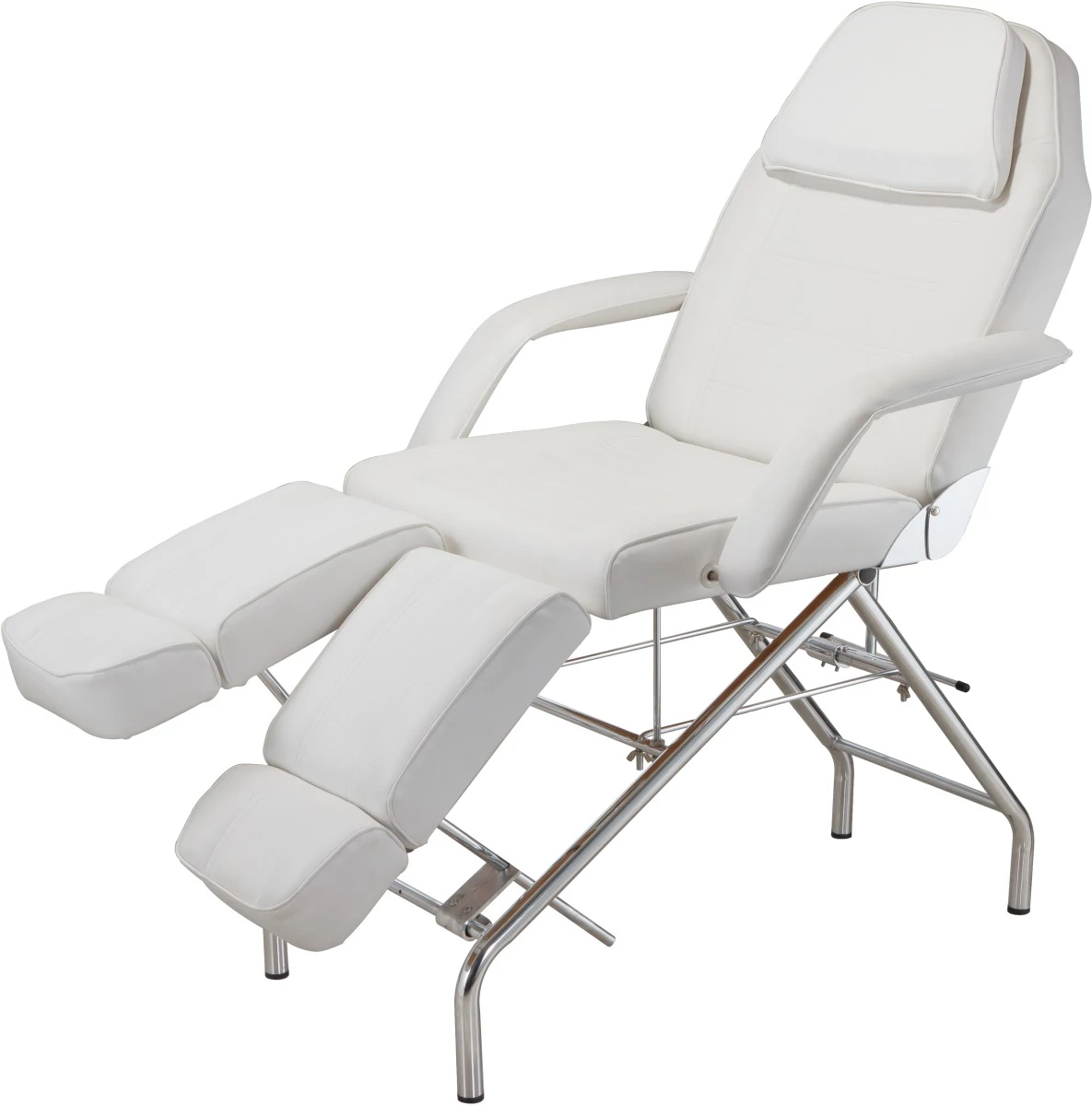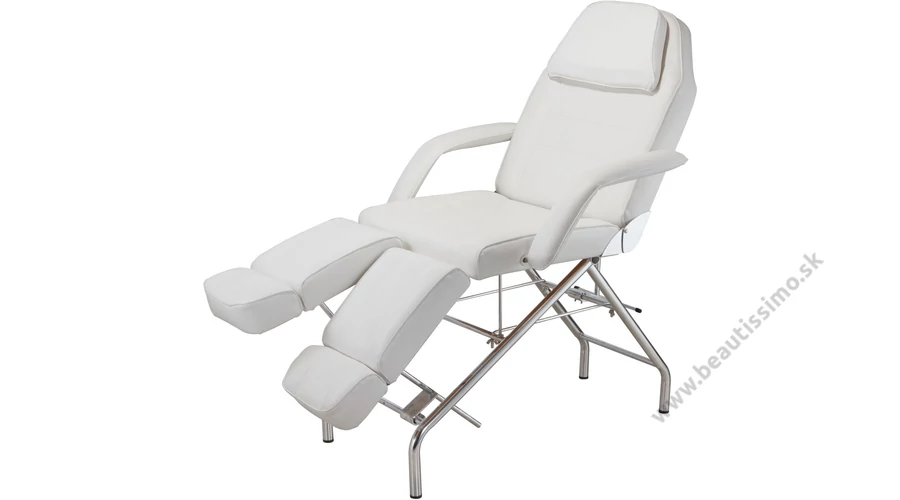 Pedikérske kreslo 2201A. Pevná výška, operadlo a ručne nastaviteľné polohy nôh a opierka chrbta. Koženka biela sa ľahko čistí. Odnímateľná opierka hlavy a lakťová opierka pomáha 402210A umožňuje viacero využití. Technické údaje: Výška: 73cm Šírka: 62 cm + lakťová opierka Dĺžka: 175 až 189 cm