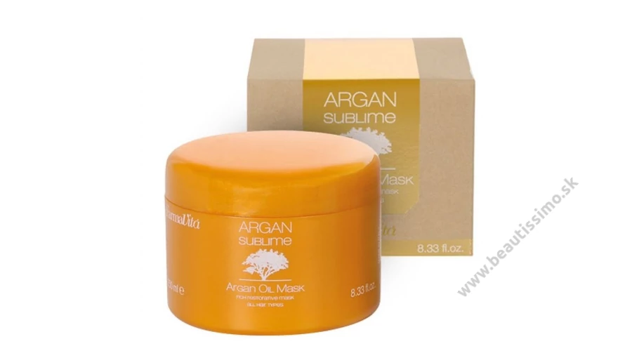 Maska na vlasy s obsahom arganového oleja (Argania Spinosa), je bohatá na výživné látky, ktoré poskytujú regeneráciu a výživu vlasov. Obsahuje zlaté kryštály, ktoré urobia tiene, záblesky a odrážanie na vlasoch. Má zlatistú farbu, krémovú textúru a krásnu exotickú vôňu. Vlasy nadobudnú pružnosť a lesk.