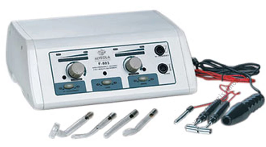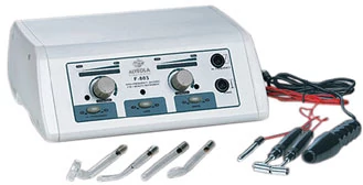 Ióntoforéza (Galván) Ióntoforéza má pozitívne a negatívne póly a tie majú rôzne účinky. Pozitívny pól: ukľudňujúci a hydratačný účinok. Negatívny pól: podporuje krvný obeh, urýchľuje metabolické procesy. Môžeme používať na tvár, hrudník, brucho, ruky, naplnenie DNA, nastavenie metabolických procesov, vďaka tomu, že prístroj má také účinky, že rozširuje cievy, rýchlejšie vnikajú do pokožky vo vode rozpustné látky. Keď začnete robiť s účinnými látkami, predtým vyčistite pokožku od predošlých krémov. Pri liečení pokožka sčervená a pri vyššom výkone cítime štípanie, svrbenie, to je narušenie pH – v takom prípade znížime výkon. Sčervenanie zmizne po liečení 1-2 hodine. Iontoforézu nepoužívame pred rôznymi spoločenskými udalosťami – jednaniami, porady, plesy. Hlavice: Valčekové hlavice – s ich používaním látky elektrolytové vnikajú do pokožky s vysokou účinnosťou. Okrem válčekových hlavíc, dá sa dokúpiť ku prístroju aj opcionálne doplnky. Účinky liečenia: - Zvýšenie metabolických procesov - Podporuje krvný obeh - Efektívne vstrebávanie účinných látok - Lupinatú a zjazvenú pokožku zmäkčuje (dezinkustrácia) Ióntoforézu nepoužívame!!!: pri zvýšenej teplote, tehotenstve, zápale, trombóze, kardioviskulárnom prístroji. Vysokofrekvenčný prúd: VIO VIO prístroje patria do rodiny vysokofrekvenčných prístrojov. Po liečení priamo dostane pokožka prúd, ktorá vyvoláva chemické dráždenie. V sklenených trubiciach najčastejšie vidíme ARGO (červené) alebo NEON (modrý) vzácne plyny. Plyny ionizujú, preto lebo dostanú elektr. Prúd, vtedy pekne vidíme cez sklenené trubice farby plynov. Po liečení vznikajú iskry, keď hlavicou sa dotýkame pokožky – vtedy vzniká dezinfekčný ozón. VIO má slabší vysušovací účinok, preto vieme liečiť vynikajúco mastnú pokožku a zjazvenú pokožku. DOPORUČUJE sa na vypadávanie vlasov a na lupinatú pokožku. 150-200 kHz používané el. kozmetické liečenie – podporuje bunky a regeneračné procesy. Vzniknutý ozón vynikajúco môžeme používať na dezinfekciu po liečení na stiahnutie, regulovanie lymfatických uzlín. Pri liečení sa cievy roztiahnu a začnú regeneračné protizápalové procesy. Upozornenie: VIO nepoužívame pri tehotenstve a pri kovových implantátoch. POPIS PRÍSTROJA 1. Tlačidlo na zapnutie VIO (HI Frequency) 2. Ukazovateľ VIO – svetlo 3. Ukazovateľ VIO – výkon 4. Výkon VIO – zvýšenie/zníženie (H/ENERGY) 5. Tlačidlo na zapnutie galvanického prúdu (Iónový) 6. +/- (LEAD) póly 7. Ukazovateľ na galvanický prúd 8. Ukazovateľ na galvanický prúd, zvýšenie/zníženie (ENERGY) 9. Ukazovateľ pólov (červené: + pozitív, zelené: - negatív) 10. Prípojky na galvanický prúd 11. Prípojka na VIO hlavice Nastavenie prístroja: - Zapojte prístroj do el. siete -230 V - Stlačte tlačidlo „ION“ ukazovateľ svieti a ukazovateľ výkonu ukazuje „0“ - Pred liečením kozmetička odstráni zákazníčke všetky kovové predmety čo má na sebe. Potom jej dajte do ruky pasívnu elektródu keď leží pacient na chrbte. - Vyberte póly podľa účinných látok „LEAD“ tlačidlom. Tlačidlo svieti červene v normálnej situácií: pól + pozitív. Po stlačení tlačidla ukazovateľ svieti na zeleno – hlavice majú negatívny náboj. - Zvýšením výkonu „I/ENERGY“ začneme liečbu. Zvolenie výkonu závisí od klienta . každý človek ináč cíti a reaguje na el. energiu. - Po skončení liečby znížte výkon prúdu „I/ENERGY“ tlačidlom, zoberieme hlavice z pokožky a vypneme prístroj a odstránime pasívnu elektródu u klienta. UPOZORNENIE: Pri používaní tejto funkcie sa obidve hlavice musia dotýkať pokožky. VÝKON GALVAN PRÚDU Max. výkon hlavice 0,45mA a môžeme postupovať 9 krokmi. PRAVÁ HLAVICA ĽAVÁ HLAVICA Krok mA Krok mA 1 0,05 1 0,05 2 0,1 2 0,1 3 0,15 3 0,15 4 0,2 4 0,2 5 0,25 5 0,25 6 0,3 6 0,3 7 0,35 7 0,35 8 0,4 8 0,4 9om 0,45 8 0,15