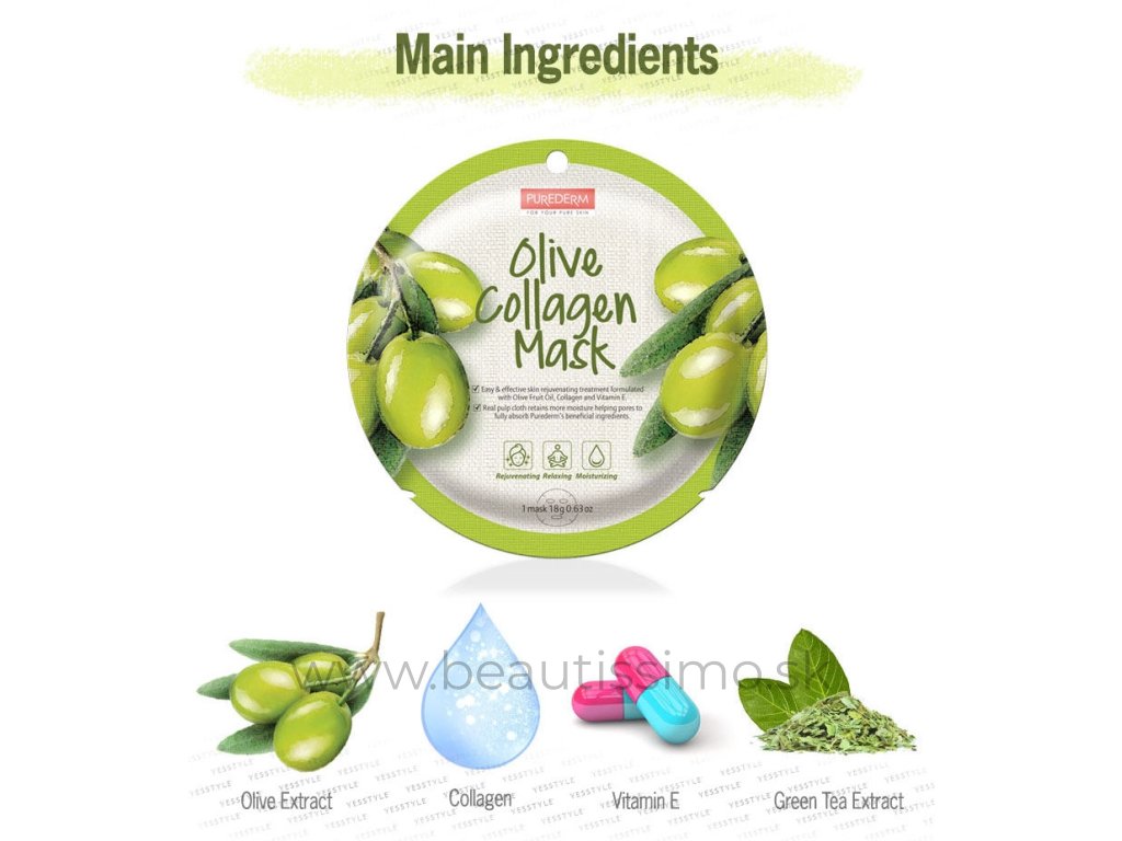 Táto maska je súčasťou kórejskej kozmetiky Purederm, ktorá kombinuje prírodné ingrediencie a pokročilé K-Beauty technológie, aby poskytla pleti intenzívnu starostlivosť. Olivový olej spolu s kolagénom a vitamínom E zanecháva pleť jemnú, hydratovanú a žiarivú.