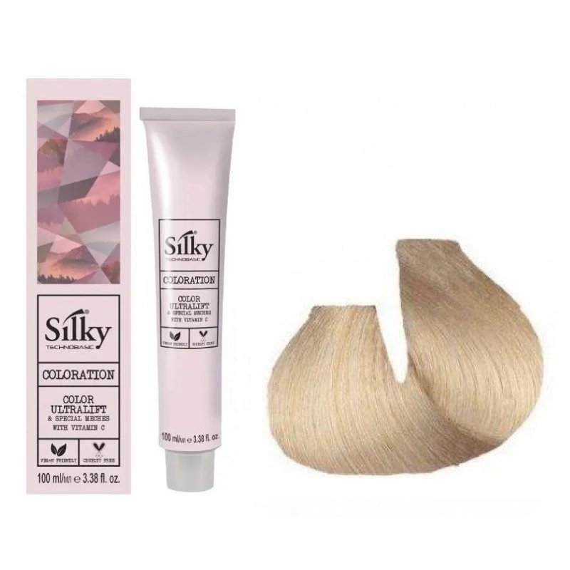 Profesionálna, vegánska, permanentná krémová farba na vlasy Silky Color s vybranými, novo vyvinutými zložkami. Balenie neobsahuje peroxid vodíka, ten sa zvolí na základe pôvodnej a požadovanej farby vlasov. Dostupné krémové peroxidy: 3%, 6%, 9%, 12% Prirodzené vlasy je možné použitím Silky základných farieb zosvetliť o 3 odtiene a použitím superblond farieb až o 4 odtiene. Stupeň zosvetlenia závisí aj od výberu krémového peroxidu. |