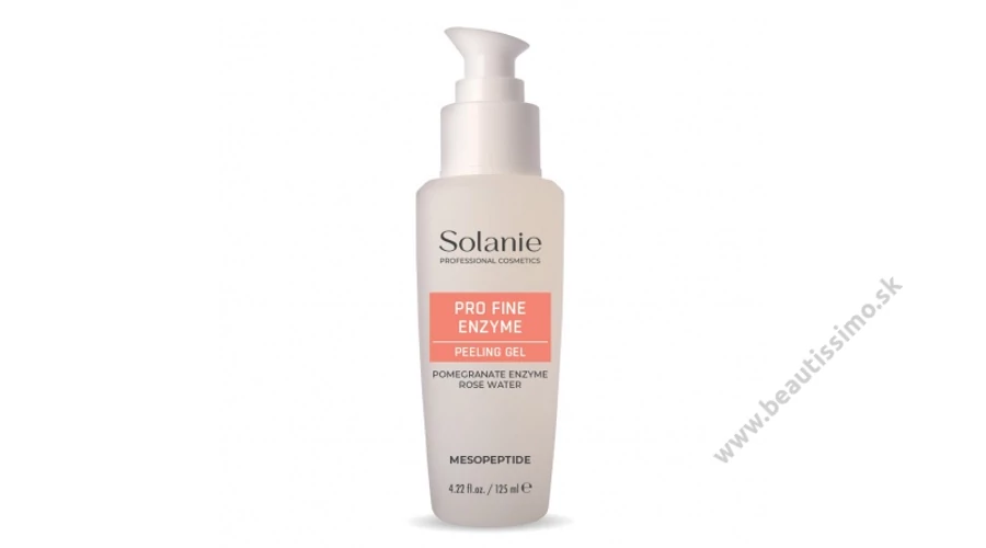 Vylepšite svoje salónne ošetrenia s enzymatickým peelingom Solanie Pro Fine zo série MesoPeptid. Tento biologický exfoliačný gél s obsahom granátového jablka – fytoenzýmu a ružovej vody jemne, no dôkladne rozpúšťa bielkovinové väzby medzi zrohovatenými bunkami, vďaka čomu efektívne odstraňuje odumreté bunky a zlepšuje priepustnosť pokožky.