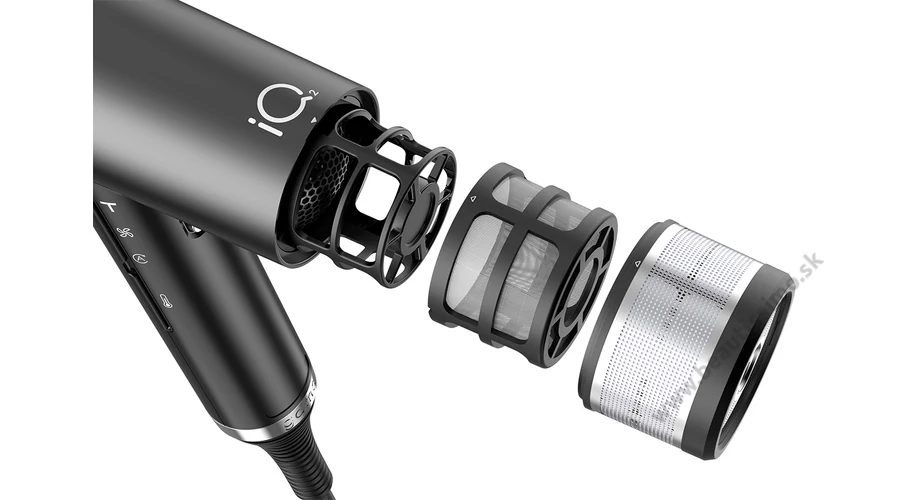 - Dva umývateľné, magnetické, mikroperforované filtre zabraňujú aj tým najmenším čiastočkám nečistôt, aby sa usadili v motore a dostali sa k vlasom a vlasovej pokožke hlavy. Pomáhajú tak uľahčiť každodenné čistenie a údržbu po intenzívnom používaní v salóne, kde sa fén denne dostane do styku s množstvom chemikálií.