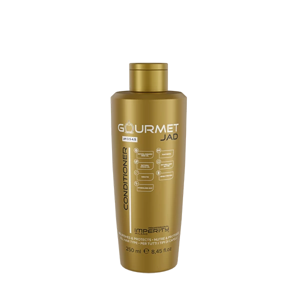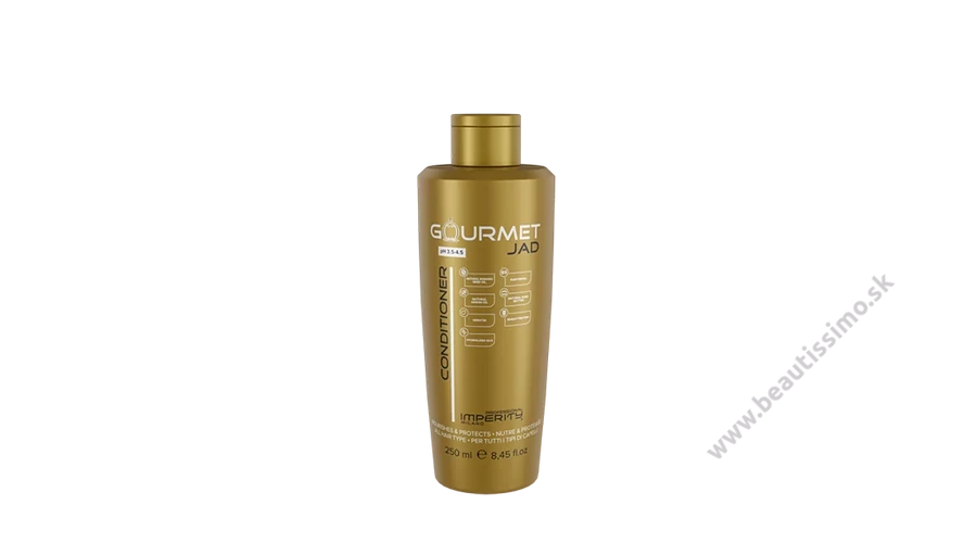Gourmet kondicionér s vôňou parfumu J’Adore 250 ml je exkluzívny kondicionér vhodný pre všetky typy vlasov. Keratín a arganový olej vlasy vyživujú a zanechávajú ich hodvábne, lesklé, objemné a voňavé. Ďalšie účinné látky regenerujú vlasovú štruktúru a zlepšujú zdravý vzhľad vlasov.