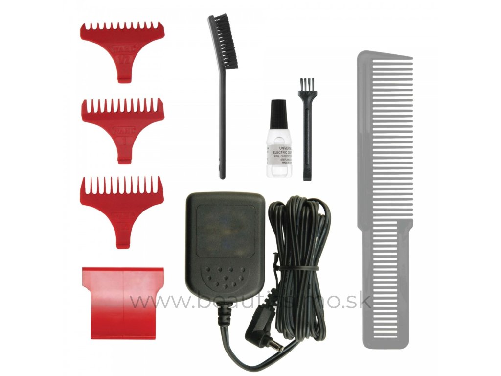 Príslušenstvo: plastové násadce na strihaciu hlavu 1,5 / 3 / 4,5 mm, barberovská kefka, štetec na čistenie, trafo s nabíjacou stanicou, strihací hrebeň a chránič na strihaciu hlavu, olejček